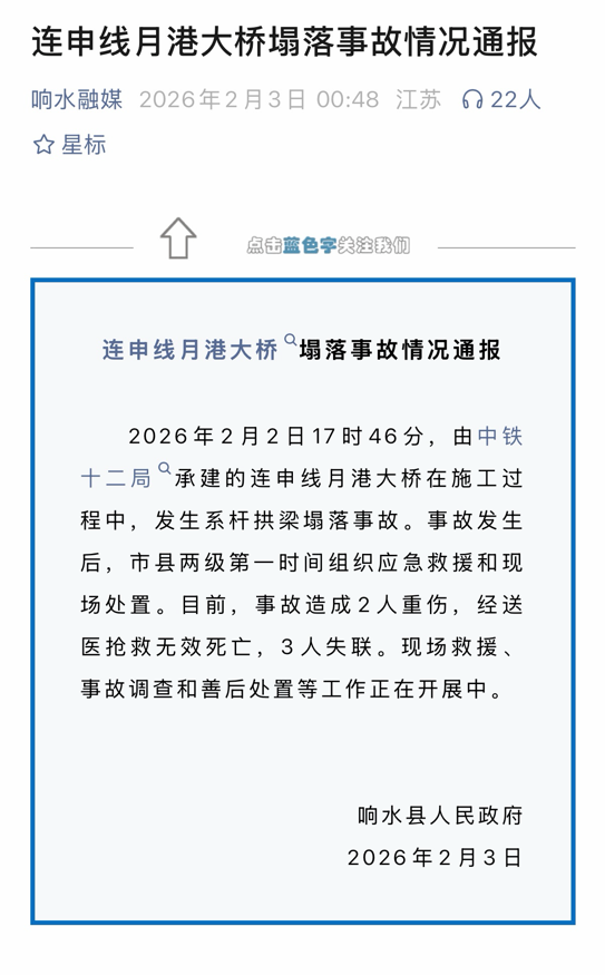 2月3日凌晨,江苏省盐城市响水县人民政府通报称,2026年2月2日17时46分,由中铁十二局承建的连申线月港大桥在施工过程中,发生系杆拱梁塌落事故。事故发生后,市县两级第一时间组织应急救援和现场处置。目前,事故造成2人重伤,经送医抢救无效死亡,3人失联。现场救援、事故调查和善后处置等工作正在开展中。