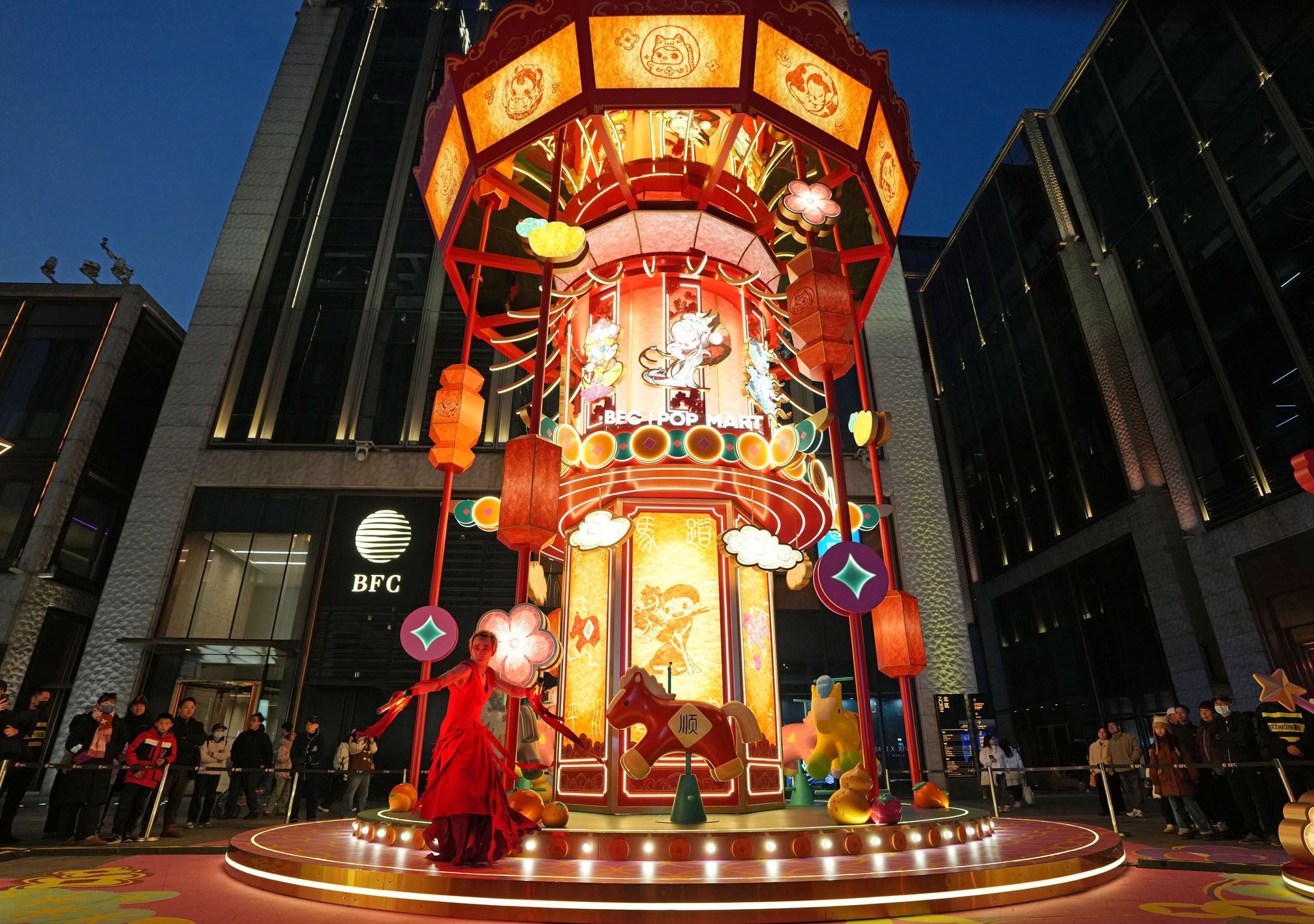 图为2月1日晚,宫灯造型的旋转木马装置在BFC外滩金融中心前点亮,启动新春游园会。
