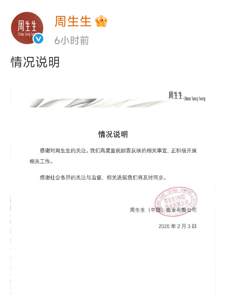 记者注意到,2月3日,“周生生”微博发布一则情况说明显示:“感谢对周生生的关注。我们高度重视顾客反映的相关事宜,正积极开展相关工作。感谢社会各界的关注与监督,相关进展我们将及时同步。”