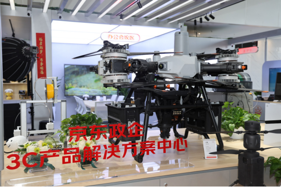 国产化区则集中展示了以联想、长城等为代表的品牌设备,彰显了对信息技术应用创新与安全可控需求的坚实支撑。大件区陈列了览众无人机、翼飞穿越机等专业级装备,展现了其在特种作业与内容创作等领域的解决方案实力;小件区则汇聚了vivo旗舰手机、韶音运动耳机等高品质个人设备;中心还设有办公会议区与直播区,共同勾勒出智慧办公、数字内容创作的未来图景。这些区域构建了从专业生产工具、核心办公设备到员工关怀产品的完整体验闭环,系统诠释了京东政企业务服务于办公日用、员工福利、生产辅助等企业全链路采购需求的综合能力。