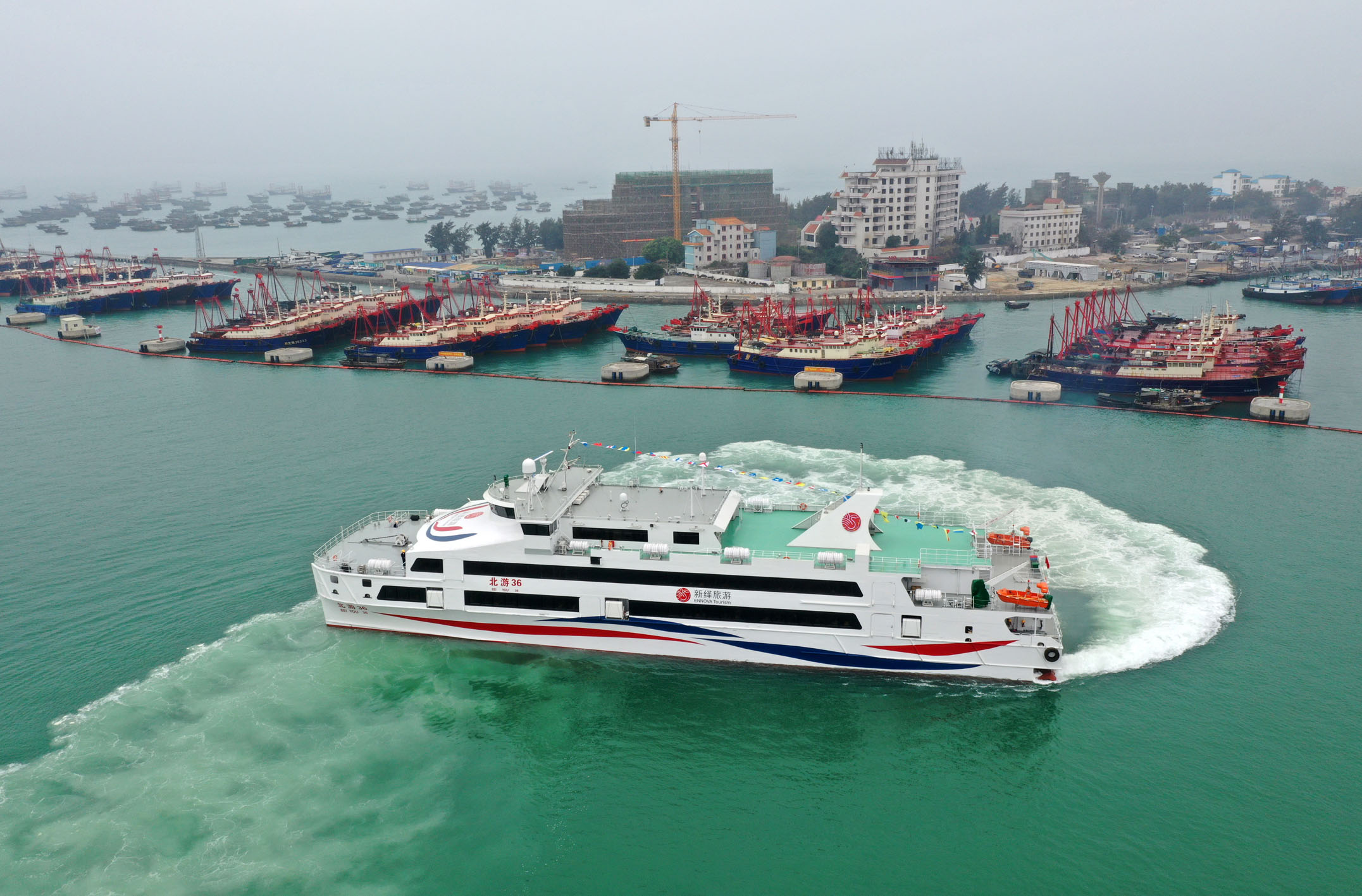“北游36”轮在广西北海国际客运港启航(2月5日摄,无人机照片)。2月5日,“北游36”轮在广西北海国际客运港首航,由北海驶往涠洲岛,正式投入当地水路春运。据介绍,“北游36”轮是广西最新投入的一艘1200客位的高速客船,由国内专业院所和船厂合力打造,采用了全铝合金双体结构与四机四喷泵先进推进系统,总长71米,设计航速29节,实测最大航速超过32节。