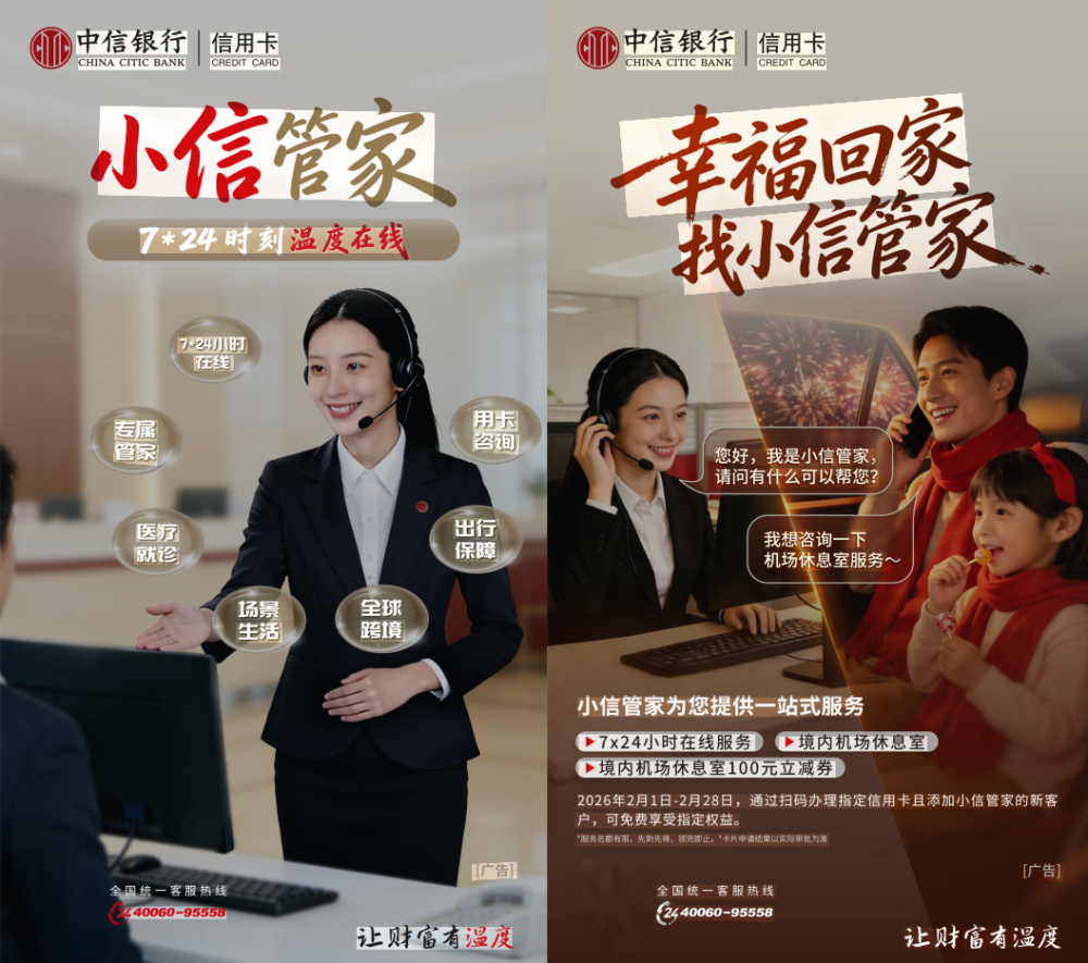 2026年是“十五五”规划的开局之年,国务院办公厅印发的《加快培育服务消费新增长点工作方案》,以优化和扩大服务供给、促进服务消费提质惠民为核心,顺应百姓从“买商品”到“享服务”和“重体验”的新趋势,为行业高质量发展提供重要指引。中信银行信用卡积极响应政策导向,值此新春消费旺季契机,以“小信管家”作为重要服务抓手,持续优化升级专业金融服务,深度融入各类消费场景,为服务消费提质升级带来金融新动能。