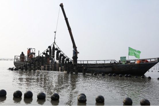春节期间,全国各地对新鲜海鲜需求增加,乳山岸边的蚝笼卸了一船又一船。