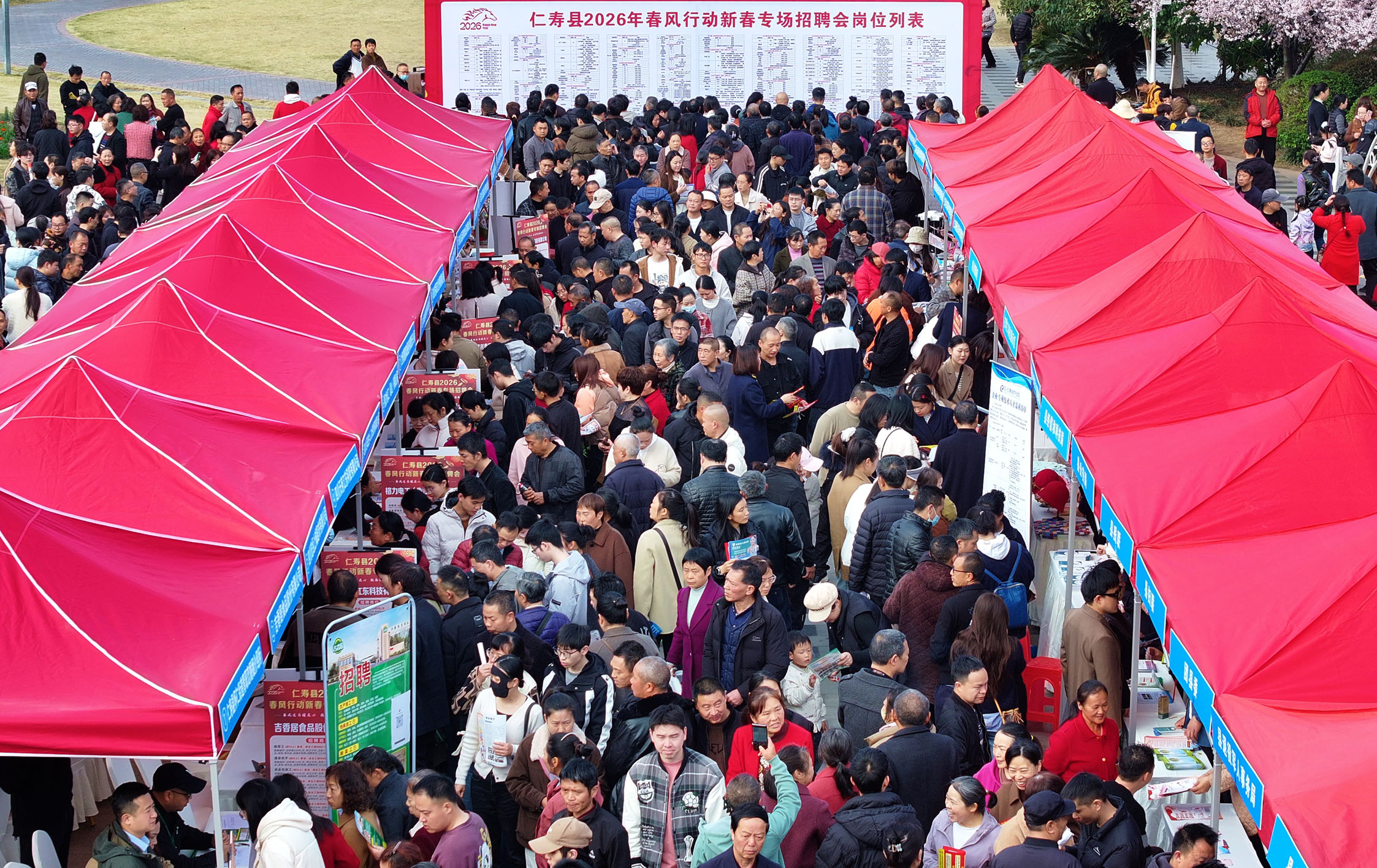近日,全国各地举行形式多样的招聘活动助力就业。图为2月25日在四川省眉山市仁寿县拍摄的2026年春风行动新春专场招聘会(无人机照片)。