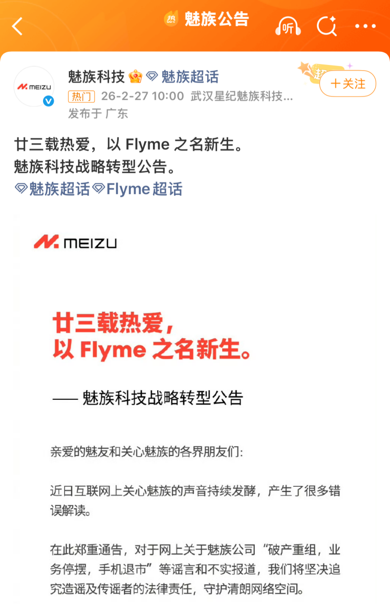 2月27日,魅族科技通过官方微博发布战略转型公告,针对近期网络上流传的“手机业务停摆、团队解散、破产重组”等传闻作出正式回应,同时宣布公司重大业务调整与战略方向。
