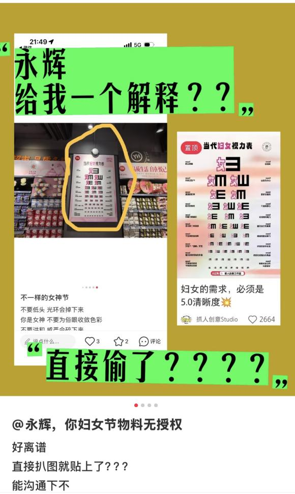 近日,有网友在社交媒体平台反映永辉超市门店未经授权盗用其原创“当代妇女视力表”海报,用于女神节主题宣传与门店布置,引发广泛关注和热议。