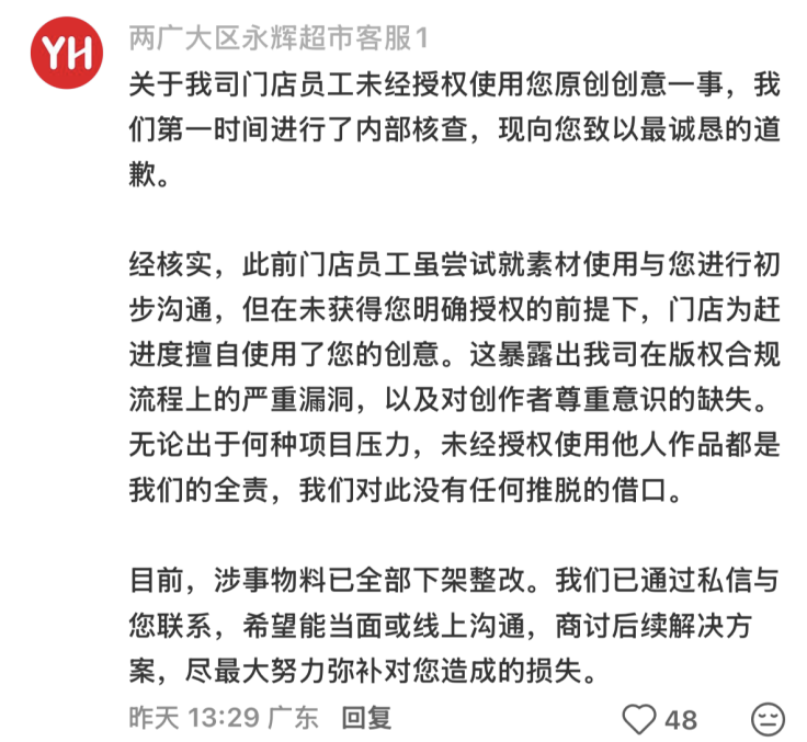 3月3日,“两广大区永辉超市客服”在原帖评论区发布致歉声明,承认涉事系门店员工为赶进度,在未取得明确授权的情况下擅自使用原创创意,暴露出企业版权合规流程存在严重漏洞、对创作者尊重意识不足。永辉超市表示,未经授权使用他人作品属企业全责,无任何推脱的借口。