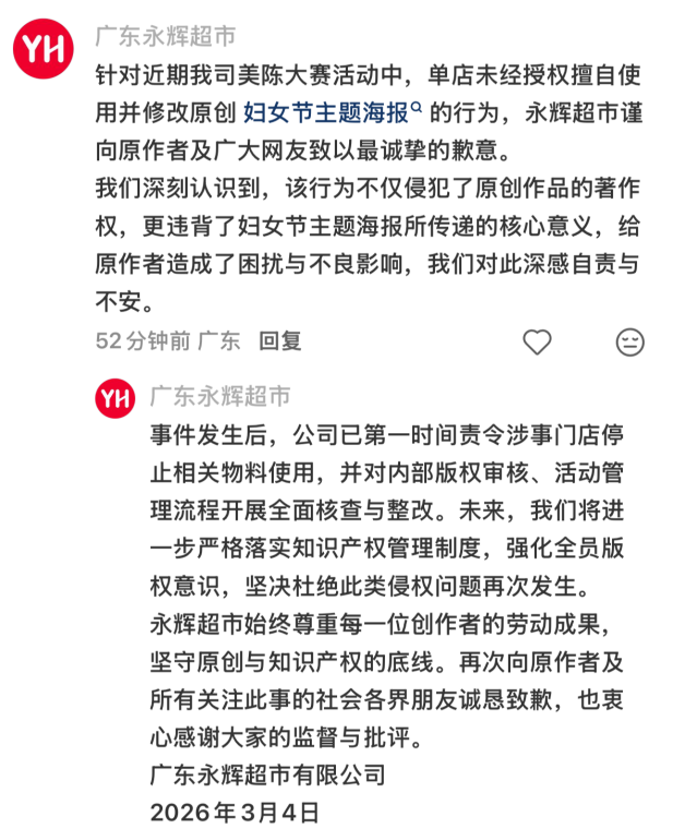 3月4日,“广东永辉超市”也在原帖下回应称,永辉超市谨向原作者及广大网友致以最诚挚的歉意,永辉超市深刻认识到,未经授权擅自使用并修改原创“妇女节主题海报”的行为不仅侵犯了原创作品的著作权,更违背了妇女节主题海报所传递的核心意义。