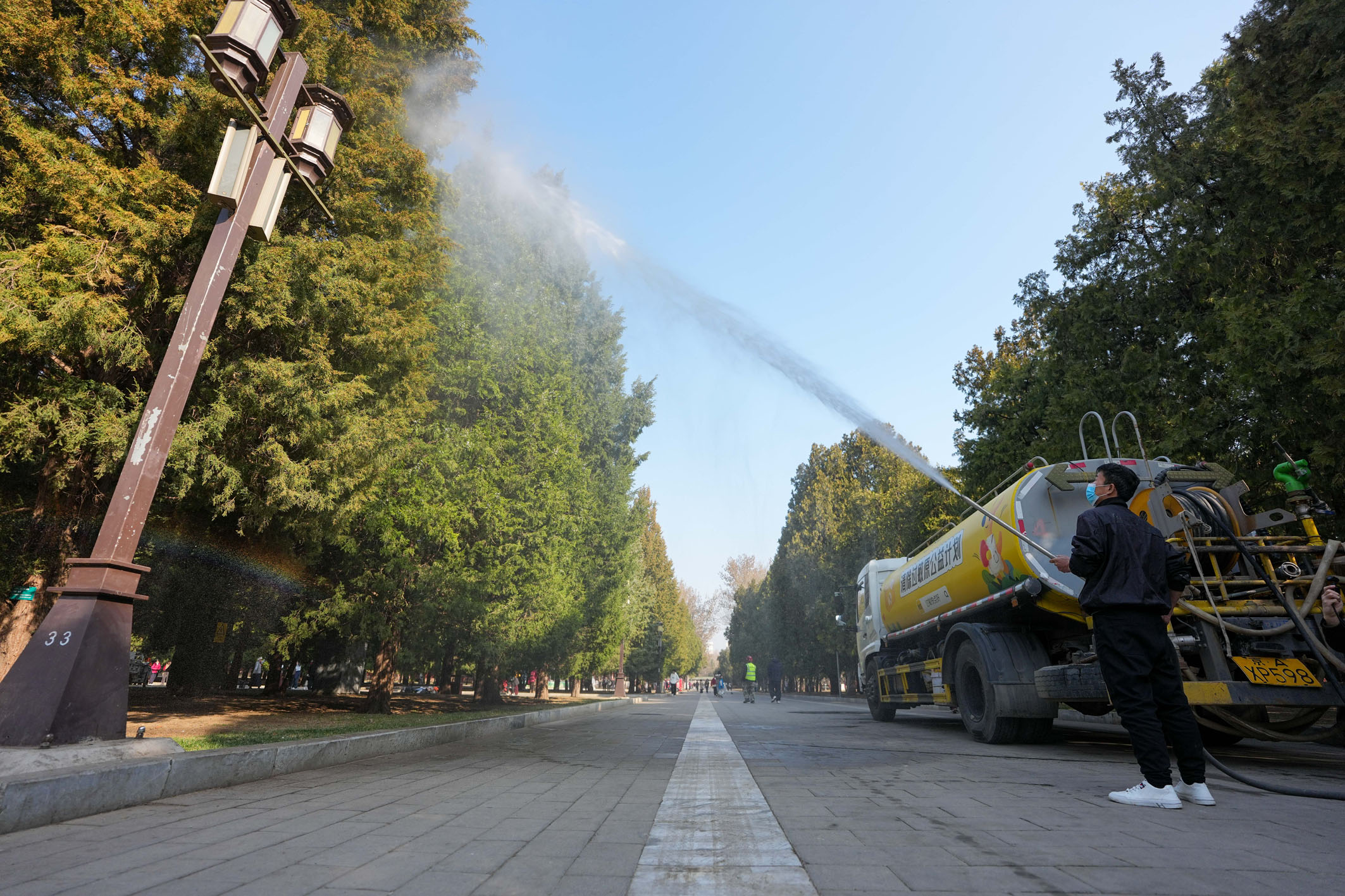 为降低致敏花粉对市民日常生活的影响,北京市园林绿化局近日已全面启动2026年致敏花粉综合防治工作。图为近日在北京地坛公园,工作人员使用添加了花粉固定剂的水对柏树进行喷淋。