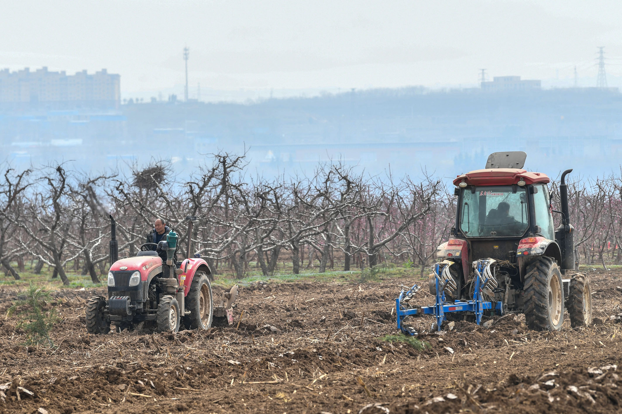 图为3月19日,山西省运城市平陆县张村镇的农民进行翻地作业。