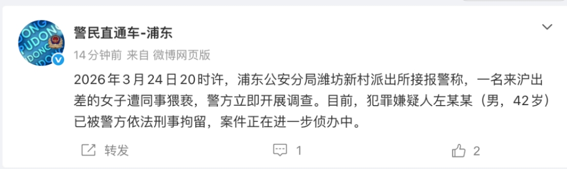 3月25日晚间,上海市公安局浦东分局官方微博发布通报:2026年3月24日20时许,浦东公安分局潍坊新村派出所接报警称,一名来沪出差的女子遭同事猥亵,警方立即开展调查。目前,犯罪嫌疑人左某某(男,42岁)已被警方依法刑事拘留,案件正在进一步侦办中。