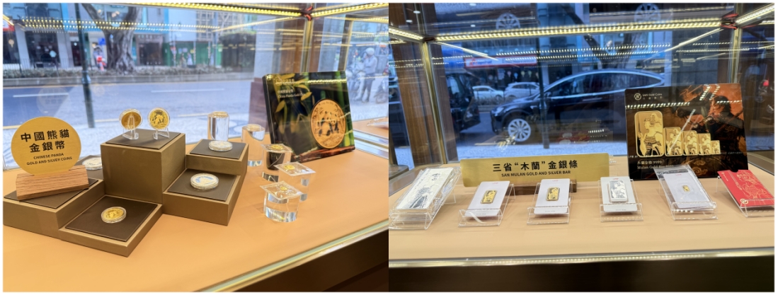 门店入口处,“SAN Gold Coins 三省金币”烫金牌匾熠熠生辉,成为濠江商圈中极具辨识度的品牌符号。在店内,集中陈列熊猫金银币、世界六大投资金银币、龙银币、木兰金银条等经典系列。熊猫币自1982年发行至今,兼具国家法定货币属性与成熟溢价回购机制,是海内外公认的投资收藏佳品;木兰金银条系列以巾帼英雄花木兰为文化内核,推出多材质、多规格精品,满足客户多样资产配置需求;龙银币则承载传统文化吉祥寓意,自2025版发行以来,深受市场青睐。