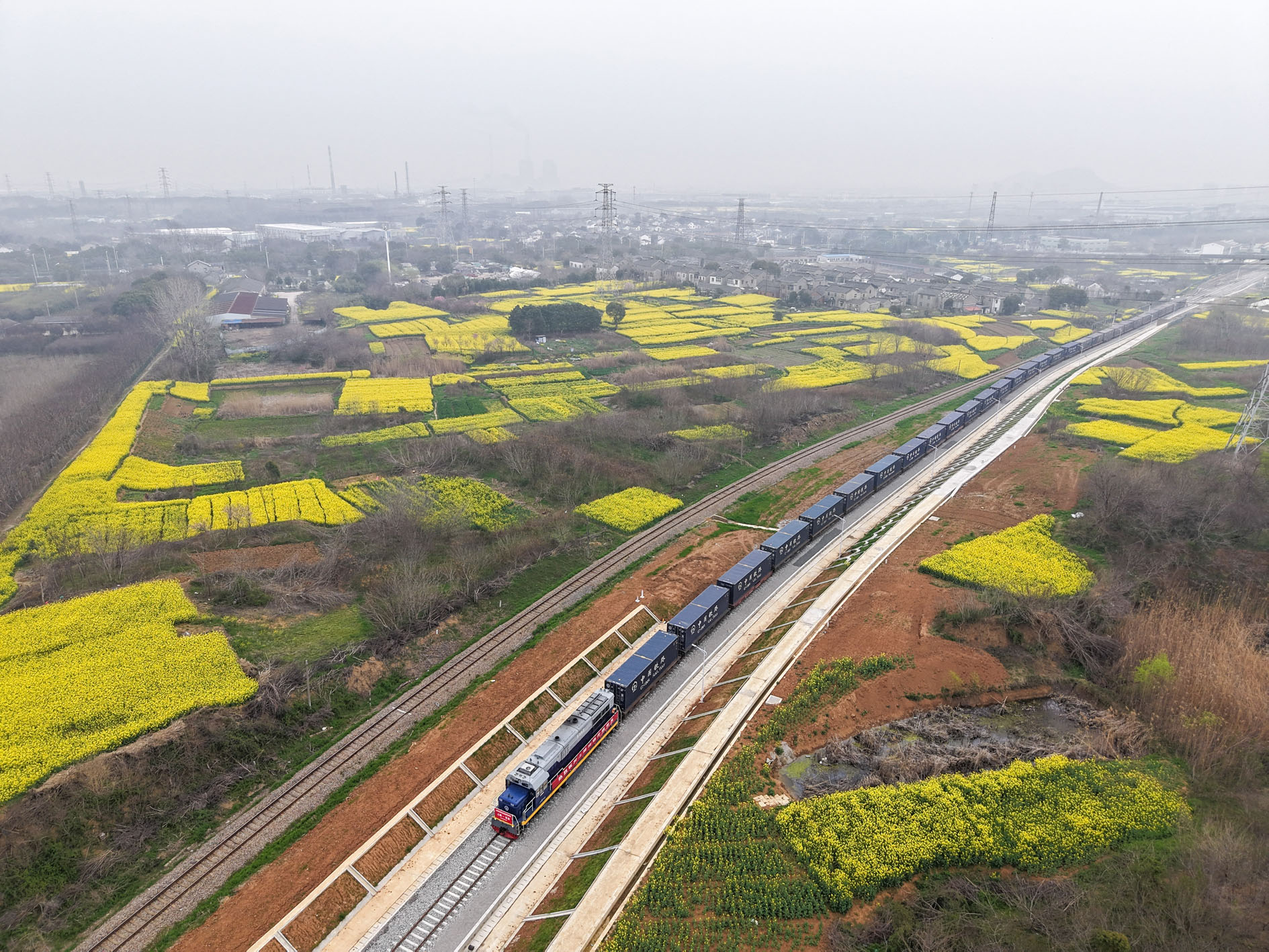 图为首趟货运列车从上隍站货场驶出(无人机照片)。