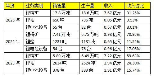 既然是关联交易,定价是否公允自然至关重要。融捷股份的产品主要包括锂精矿、锂盐和锂电池设备三大类,其2025年收入分别为7.67亿元、0.05亿元和0.67亿元,在总营收中的比重分别为91.25%、0.53%和8.01%。其中,在营收中占据核心地位的锂精矿,几乎全部销往大股东融捷集团控制的成都融捷锂业。