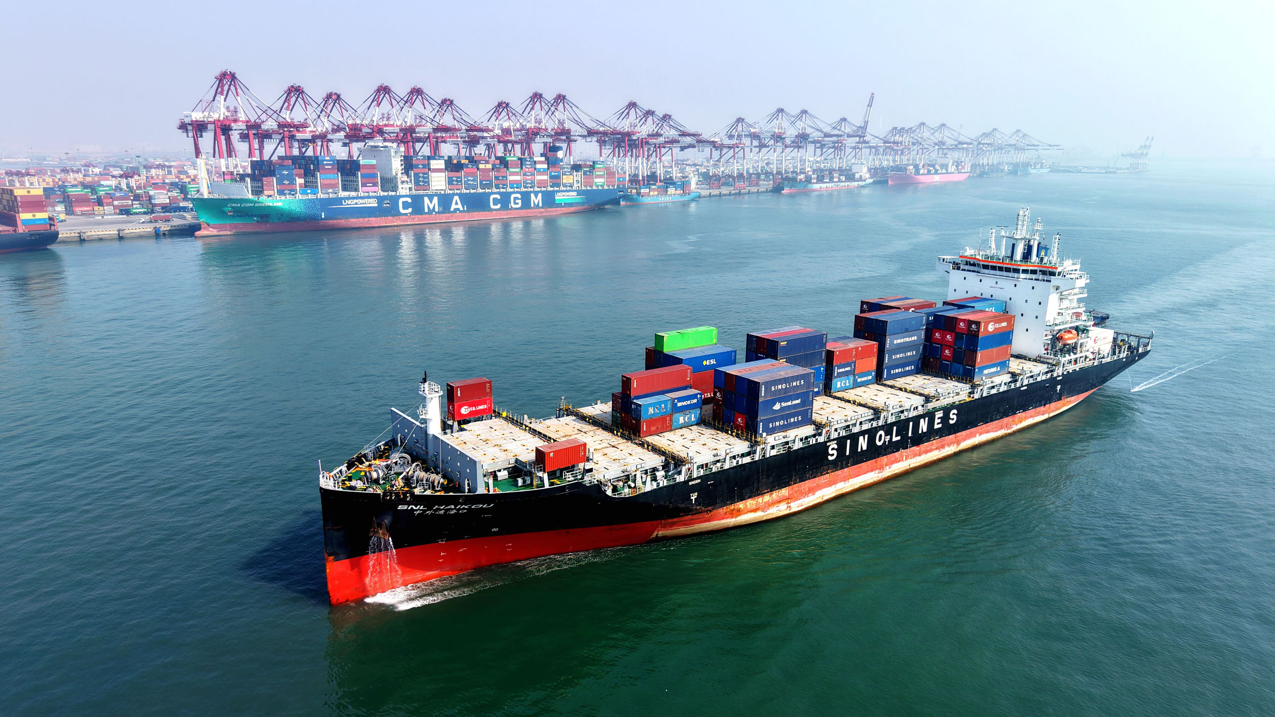 4月1日,在山东港口青岛港,一艘装载集装箱的货轮驶入港口(无人机照片)。2026年第一季度山东港口青岛港新开通7条集装箱航线。至此,青岛港一季度新开通航线已覆盖东南亚、澳大利亚、非洲、中南美等区域。