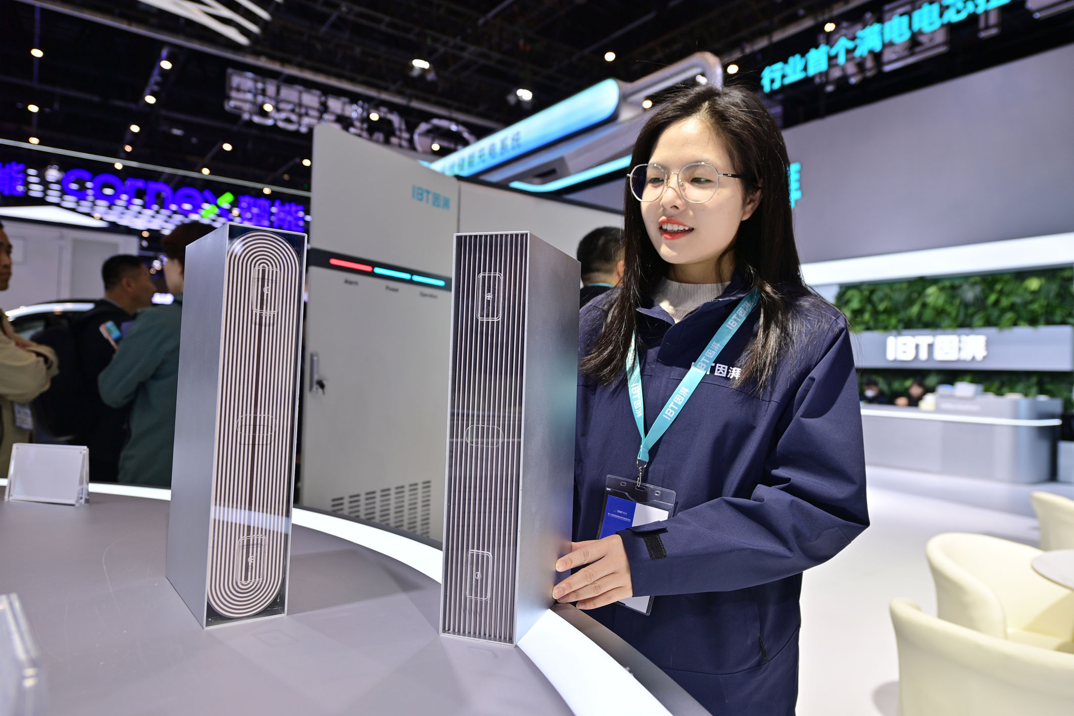 4月2日,工作人员在第十四届储能国际峰会暨展览会上介绍展品。第十四届储能国际峰会暨展览会3月31日至4月3日在北京首都国际会展中心举行。本届峰会以“场景创新 价值重构 全球共赢”为主题,展览会设立六大主题展馆。