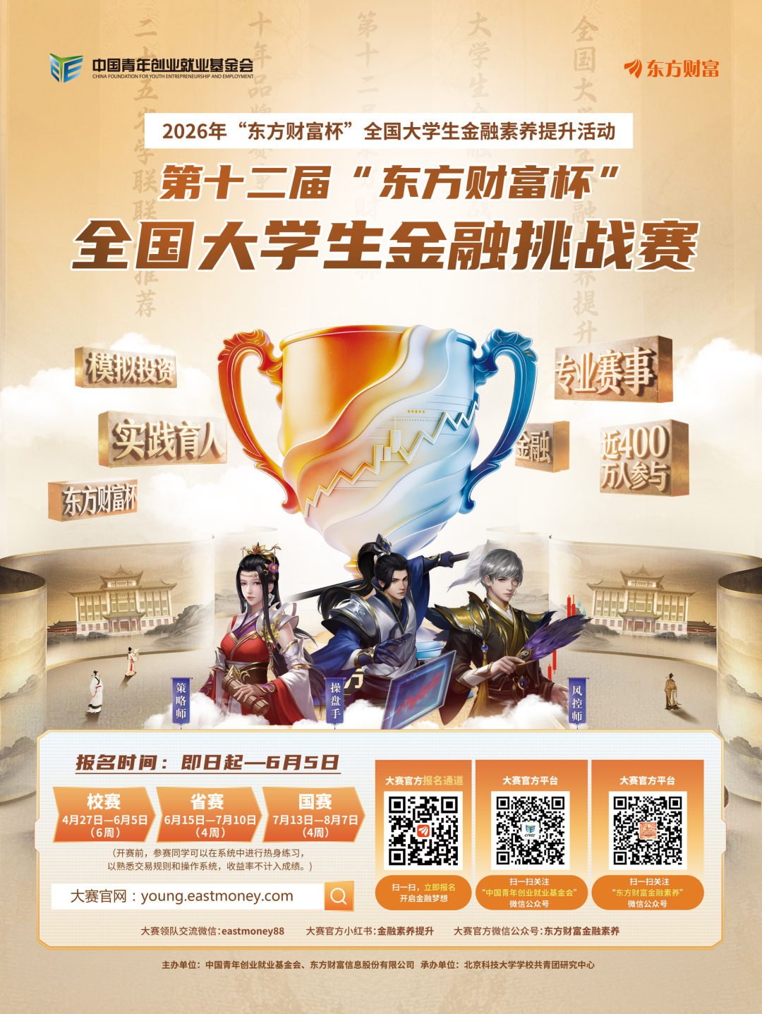 近日,由中国青年创业就业基金会、东方财富信息股份有限公司联合主办的第十二届“东方财富杯”全国大学生金融挑战赛拉开帷幕。大赛面向全国高校学生开放报名,以模拟交易为核心,搭建起集知识学习、技能实训、竞技比拼于一体的金融实践平台,旨在引导青年学生将金融理论与市场实践深度融合,提升金融素养与实操能力,为金融强国建设积蓄青年力量。