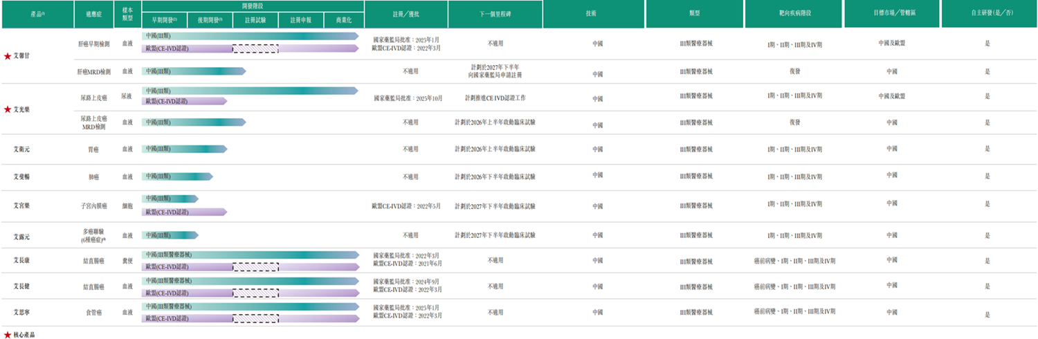 为把握市场机遇,艾米森已开发一个综合性的早期癌症检测平台,该平台拥有丰富的产品管线,通过涵盖主要癌症类型(包括结直肠癌、肝癌、尿路上皮癌及食道癌)的已获批及在研产品的产品组合,并进一步扩展至胃癌、肺癌及妇科癌等癌症类型,响应临床需求。此外,公司正在积极扩展泛癌种检测产品管线,目前正在开发一款六种高发癌症联合检测试剂。