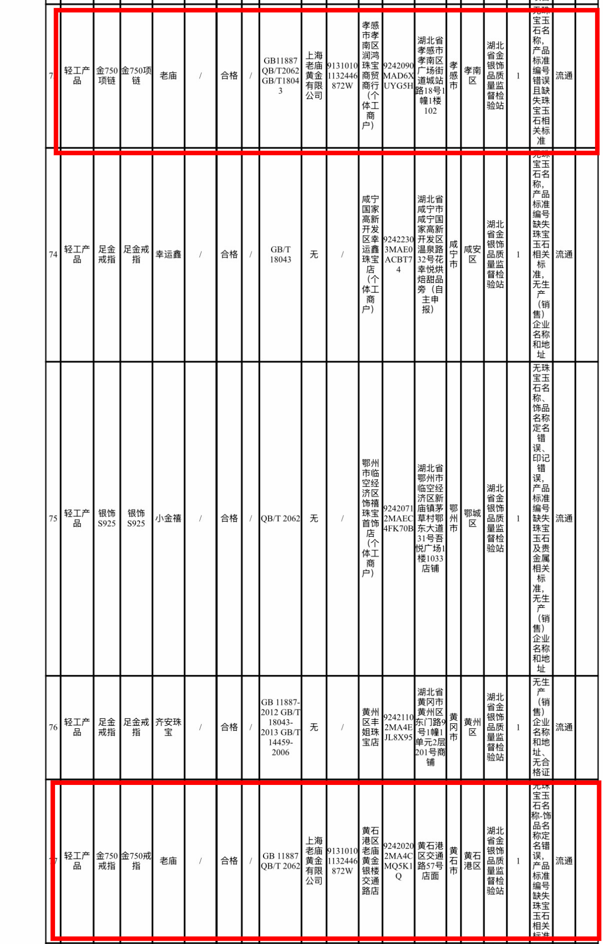 湖北省市场监督管理局官网显示,老庙黄金旗下两款K金饰品被检出不合格。通报显示,1批次标称孝感市孝南区润鸿珠宝商贸商行受检的“老庙金750项链”被检出不合格,不合格项目为无珠宝玉石名称,产品标准编号错误且缺失珠宝玉石相关标准;1批次标称黄石港区老庙黄金银楼交通路店受检的“老庙金750戒指”被检出不合格,不合格项目为无珠宝玉石名称-饰品名称定名错误,产品标准编号缺失珠宝玉石相关标准。