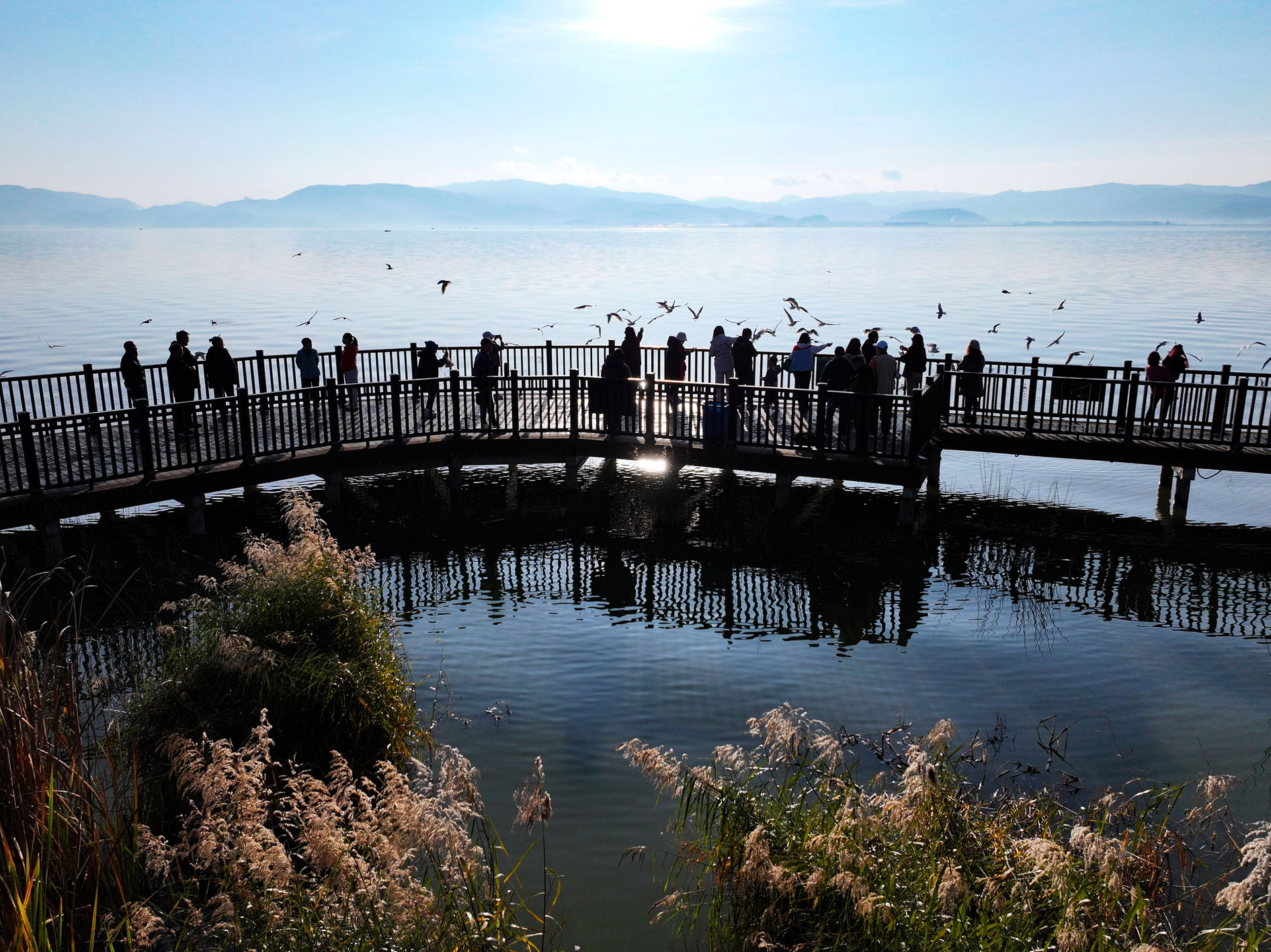 游客在云南省玉溪市通海县杞麓湖国家湿地公园与红嘴鸥互动。资料照片