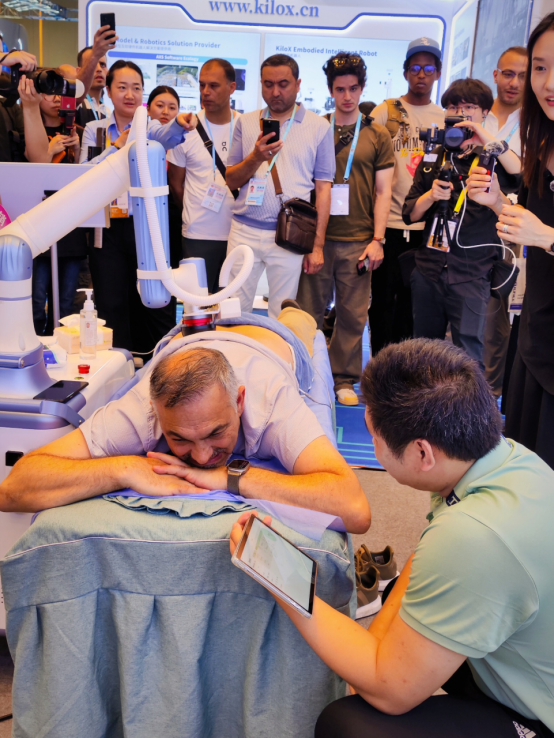 境外采购商体验按摩机器人。 记者 杨锦英 摄