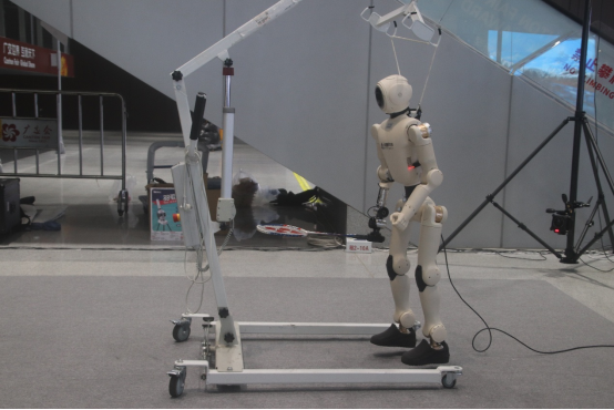 PHYBOT C2举着羽毛球拍在现场“待命”。记者 杨锦英 摄