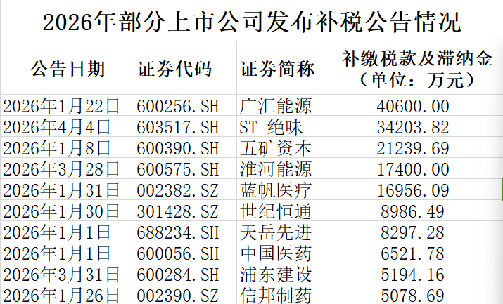 据同花顺数据显示,开年不足四月,A股至少有30家上市公司发布补税公告,合计补缴税款及滞纳金逾20亿元,覆盖主板、创业板、科创板等多个板块,行业遍及医药、能源、制造、科技、消费等领域。其中,广汇能源(4.06亿元)、ST绝味(3.42亿元)、五矿资本(2.12亿元)、淮河能源(1.74亿元)、蓝帆医疗(1.7亿元)等补缴金额均超亿元,大额补税直接冲击当期业绩。