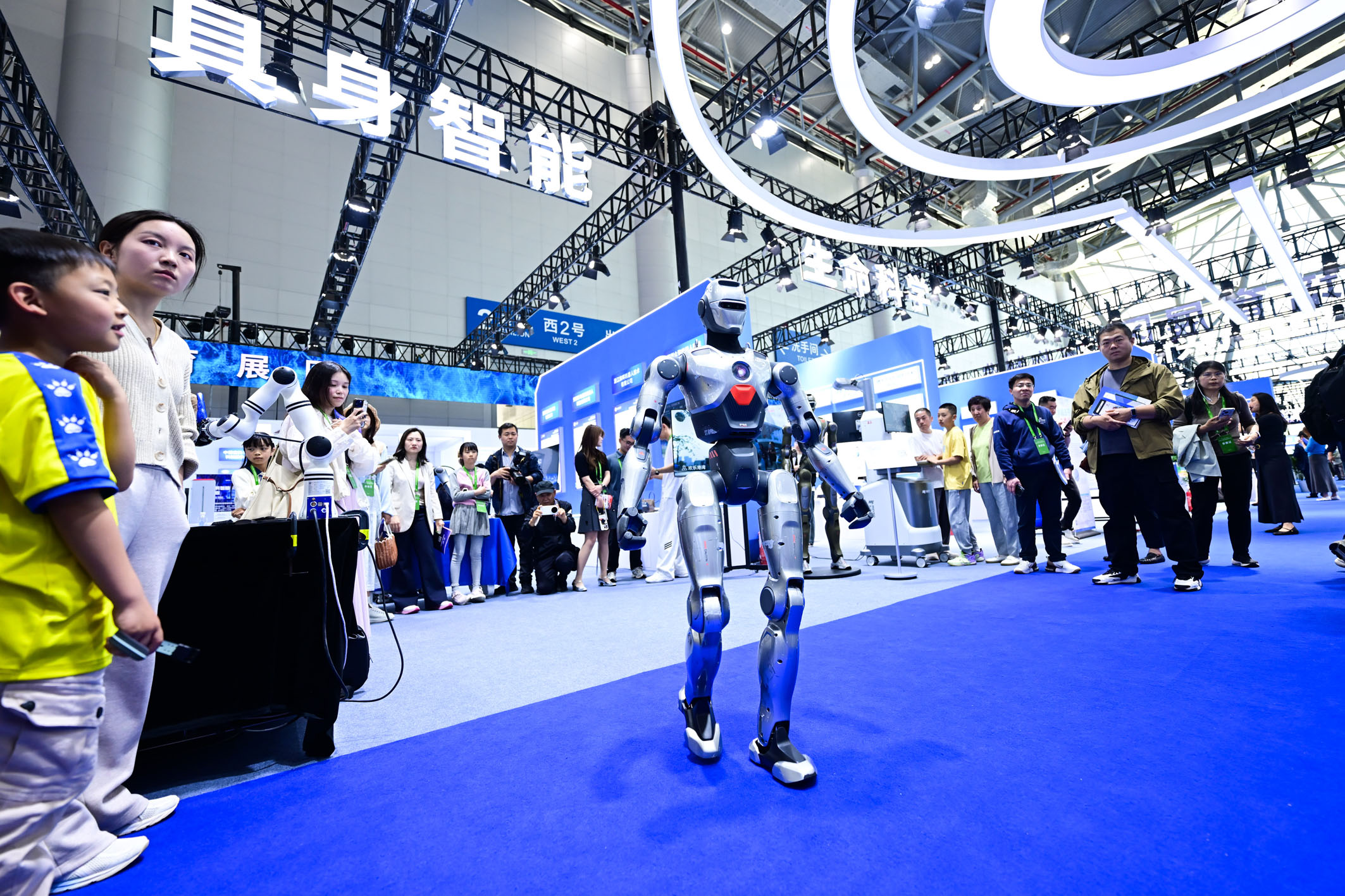 图为4月26日观众在第四届中国(安徽)科技创新成果转化交易会上观看一款人形机器人。