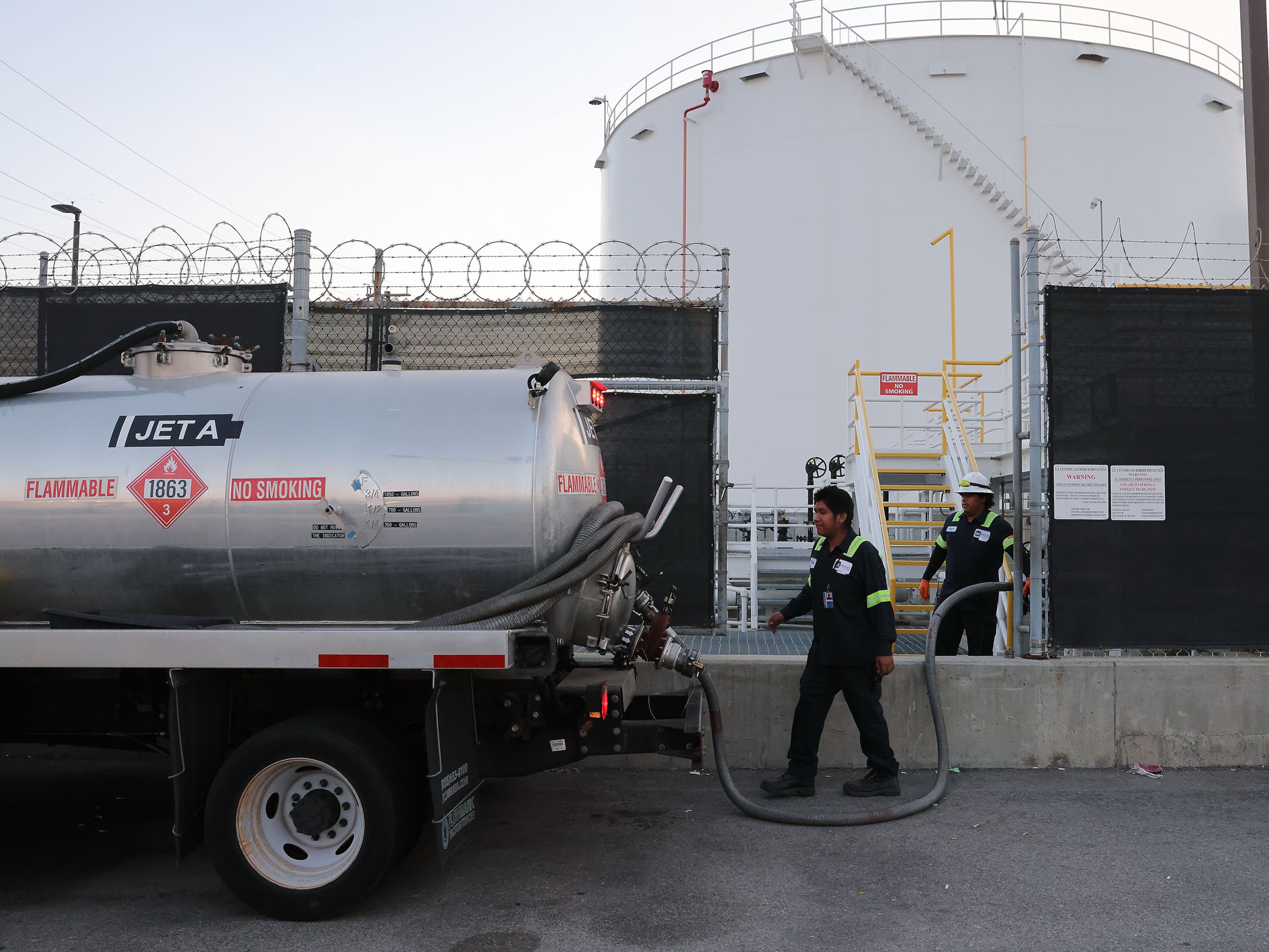 图为4月24日,在美国洛杉矶国际机场的航油站,工人为航空燃料油罐车注油。